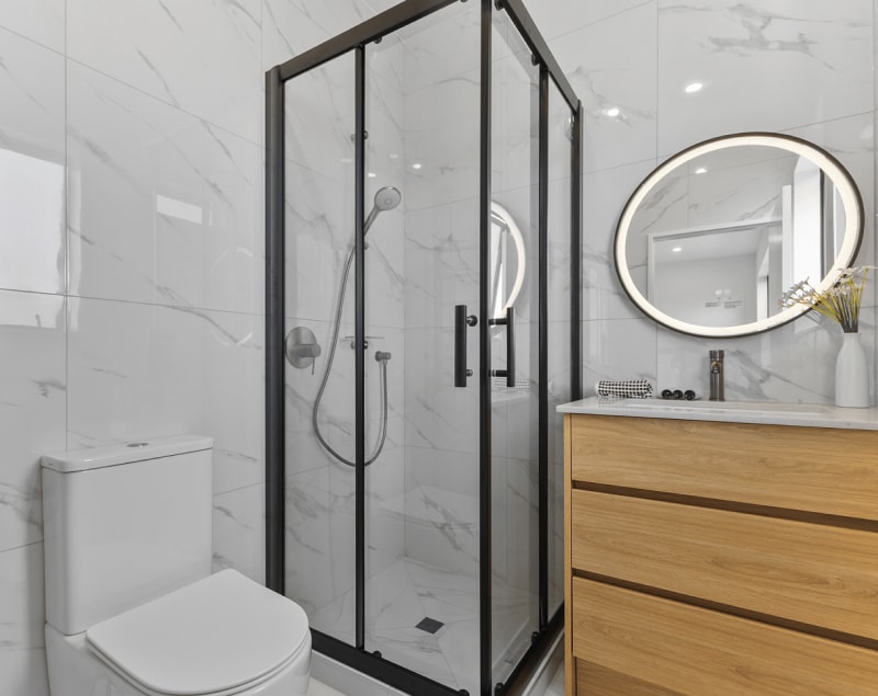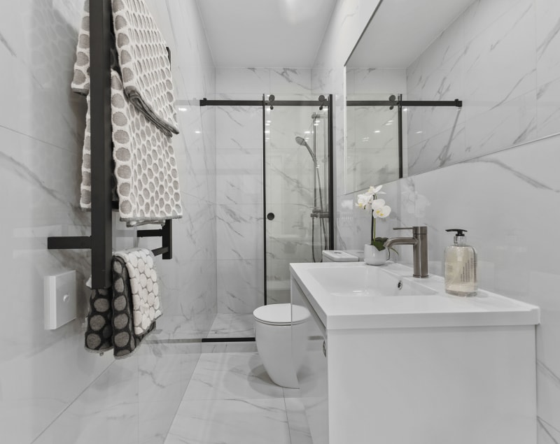 Bathrooms: Full floor-to-ceiling tiles.