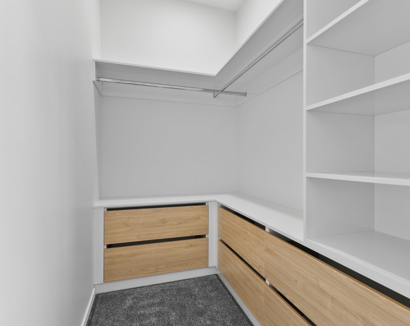 Master suite with ensuite, custom vanity with Villeroy & Boch basin, Caesarstone benchtop, Grohe tapware, and Elementi toilet. Walk-in wardrobe, second living space, two more bedrooms with custom wardrobes, plus a full bathroom.